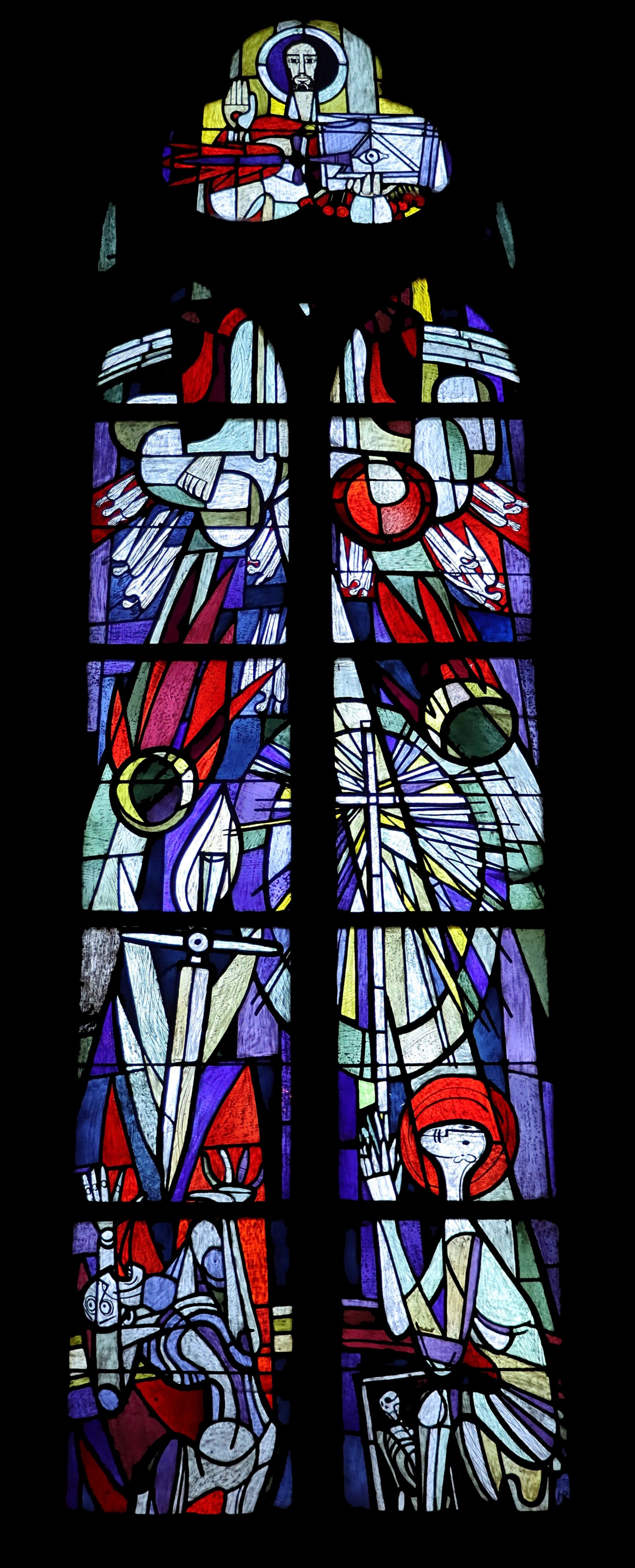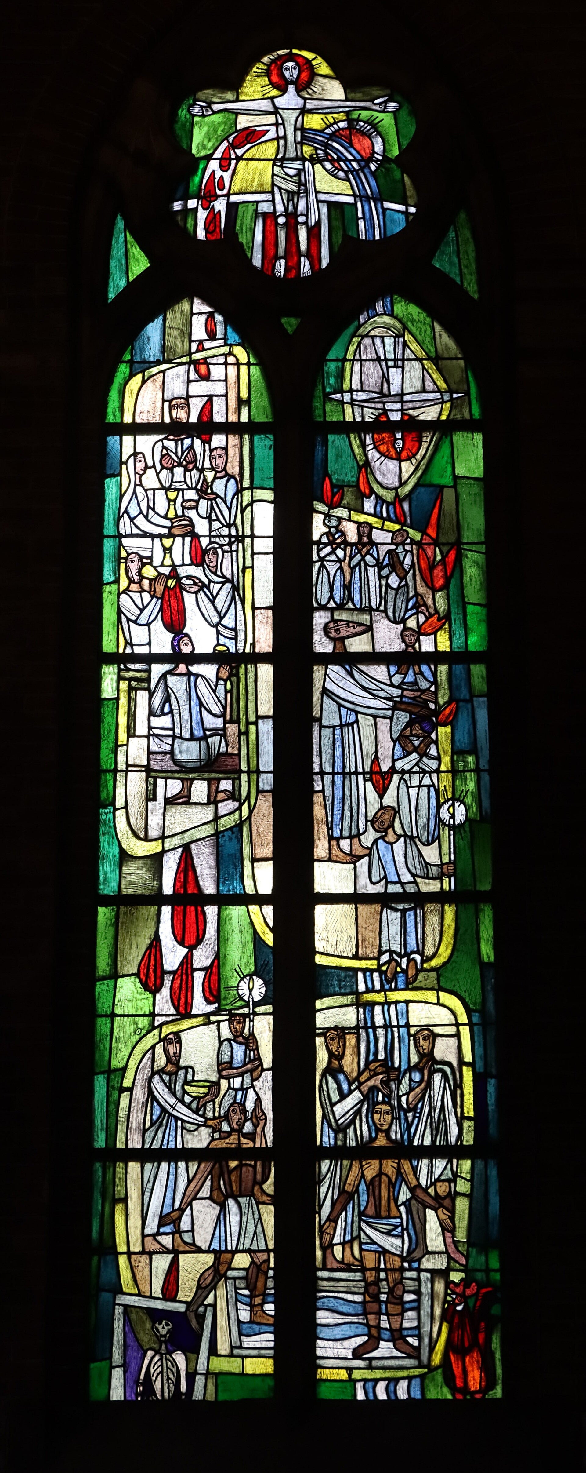 Zes ramen met de Apocalyps, de Apostolische successie, de Sacramenten, de Viering van dood en verrijzenis, de Prediking en de Parousia in de noordelijke zijbeuk en de oostwand van het noordtransept, evenals het raam met de Boom van Jesse in de zuidwand van het zuidtransept dateren uit 1957, terwijl de ramen met de Schepping, de Zondeval, het Verbond met ark van Noach en offer van Abraham, de Wetgeving op de berg Sinaï in zuidelijke zijbeuk en de oostwand van het zuidtransept uit 1958 dateren.