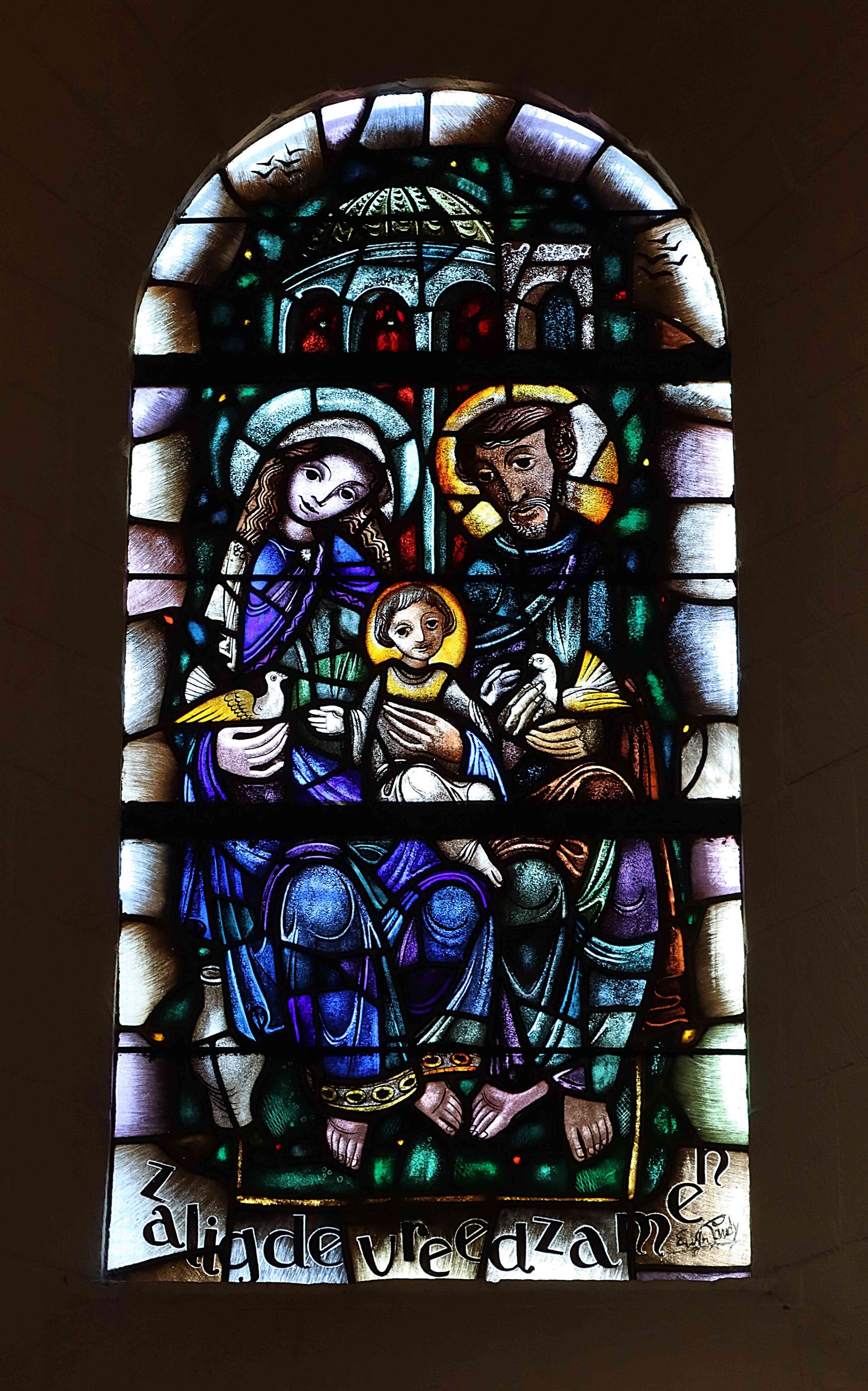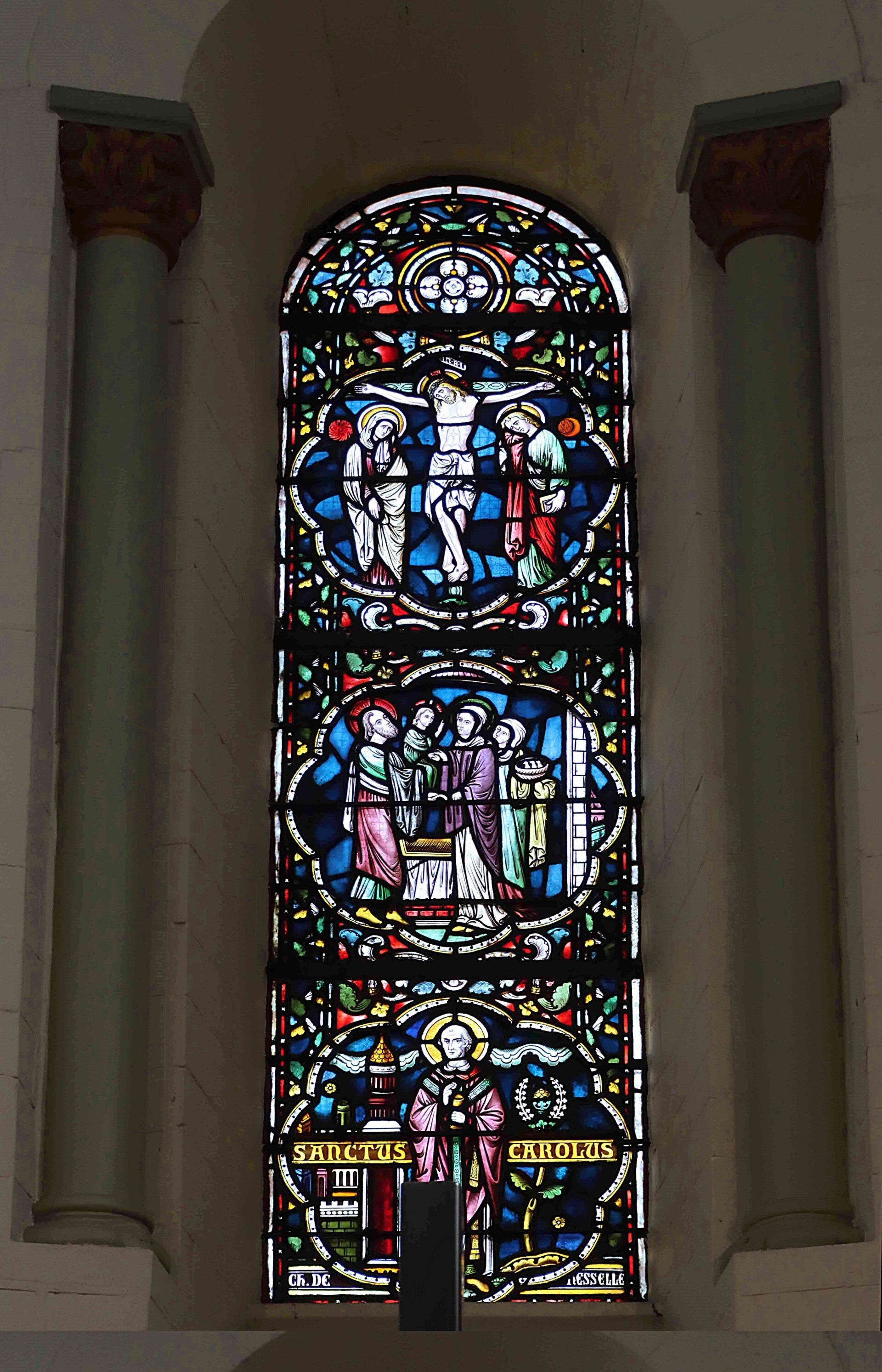 De crypte bevat 9 ramen van Eugene Laudy uit 1962; de 3 middelste ramen vormen een iconografische eenheid